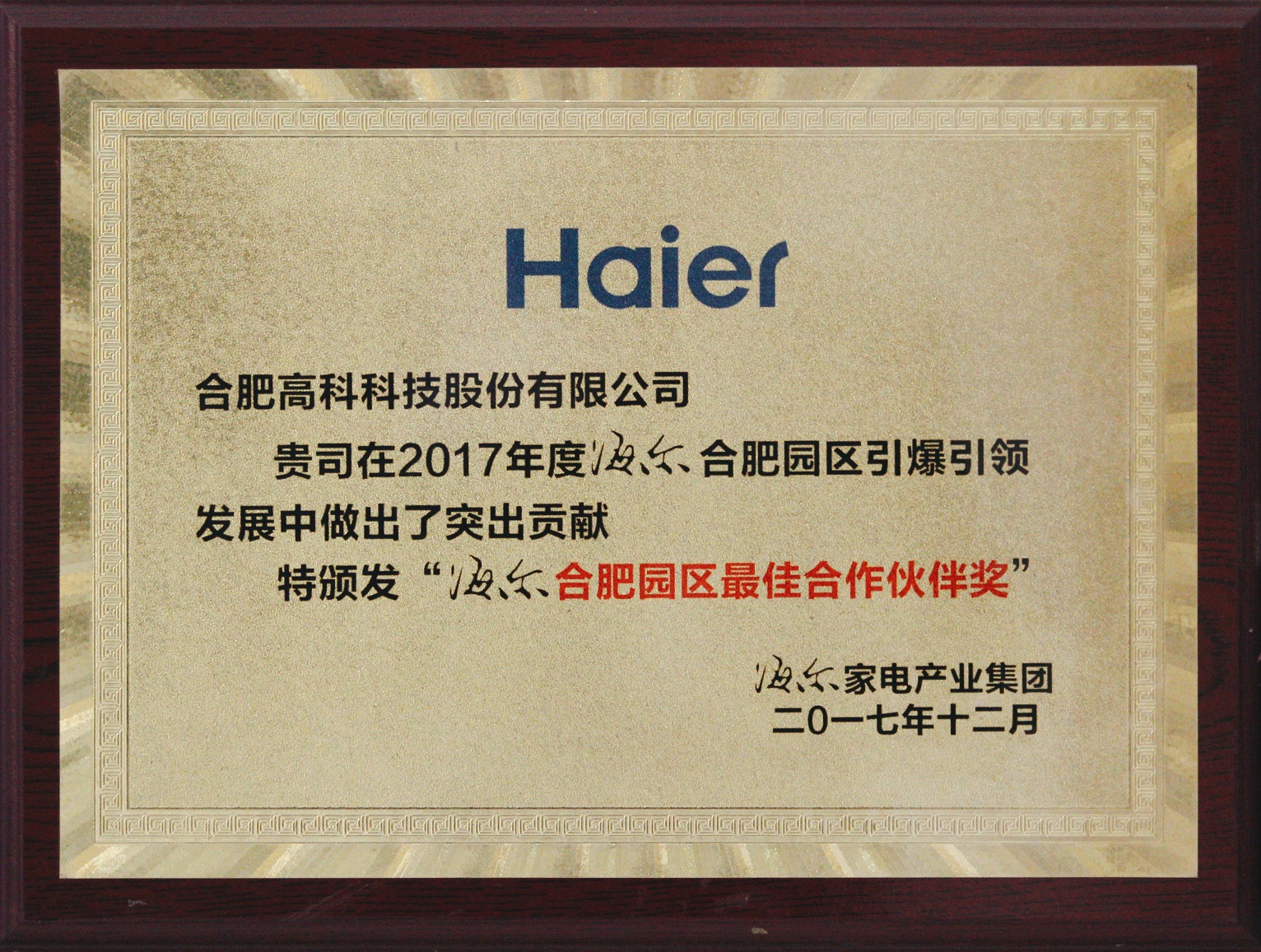 海爾合肥園區最佳合作伙伴獎